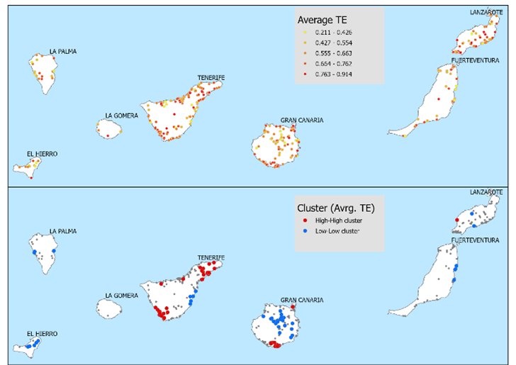 Los investigadores Pérez-Rodríguez, J. V., Suárez-Vega, R. y Hernández, J. M. presentaron en su artículo A spatial stochastic frontier model at the P2P listing level publicado en Tourism Management un método novedoso para identificar los efectos espaciales en la estimación de la eficiencia de alojamientos vacacionales. Por medio del mismo se pueden estimar efectos marginales directos e indirectos (inducidos por la vecindad) en la eficiencia económica de estos alojamientos. El modelo fue aplicado al caso de las Islas Canarias.